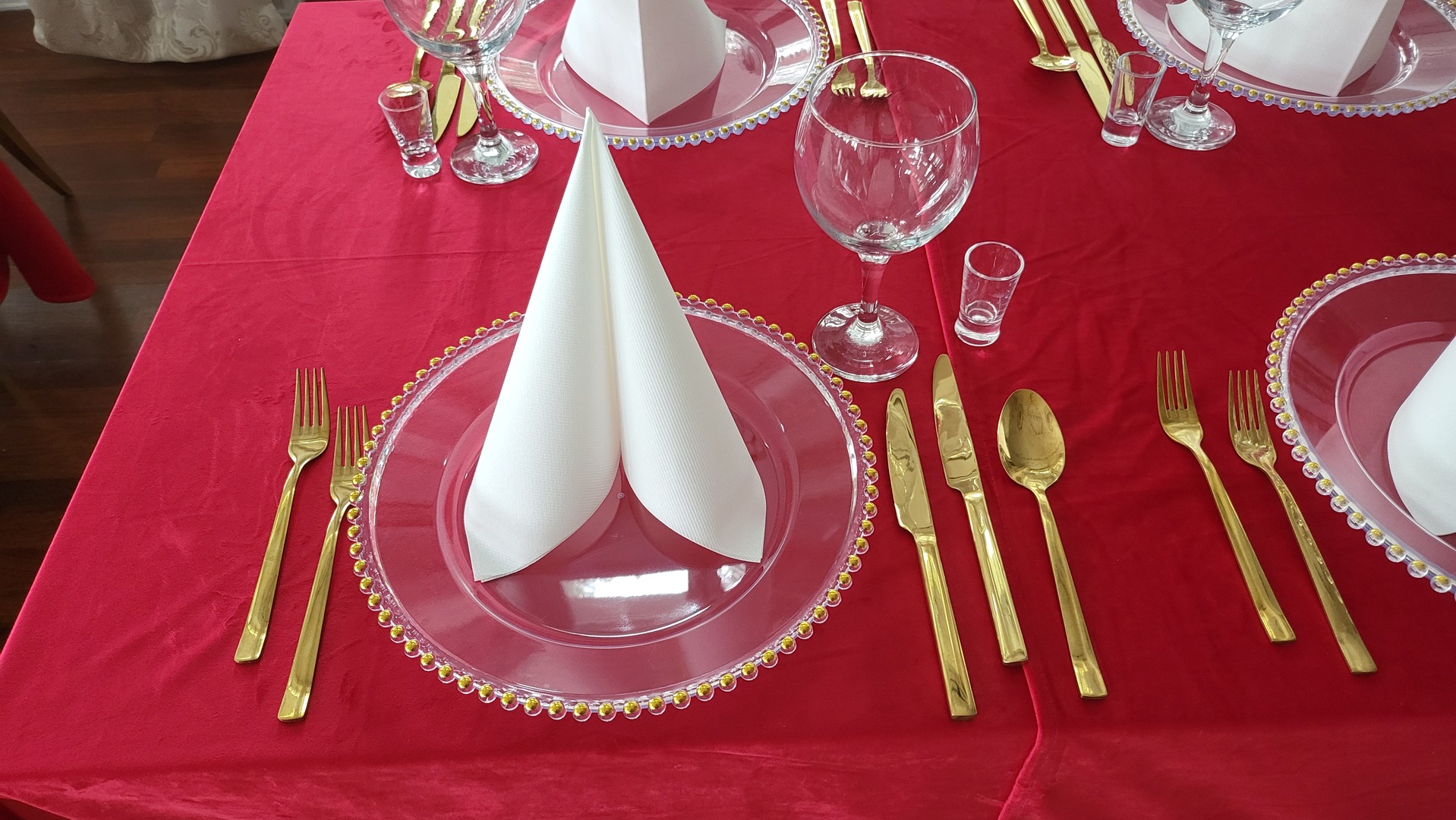 Eleganckie nakrycie: czerwony obrus, złote sztućce, przezroczyste talerze z koralikową krawędzią, stojące białe serwetki.