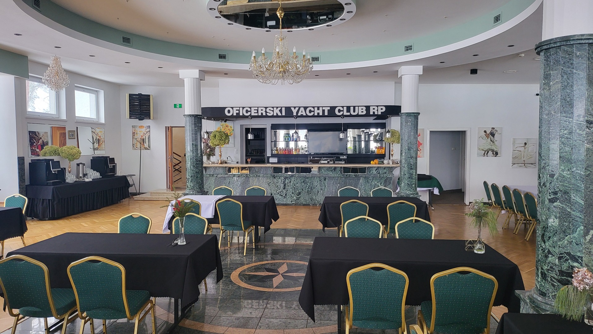 Przestronna sala klubowa z marmurowym barem Oficerski Yacht Club RP, kryształowym żyrandolem, strefą kawową i ustawionymi stołami bankietowymi